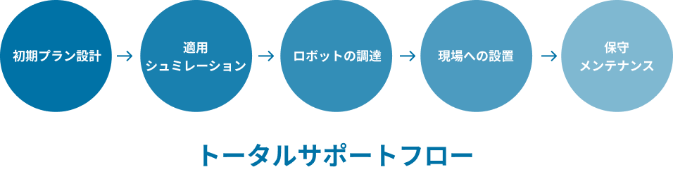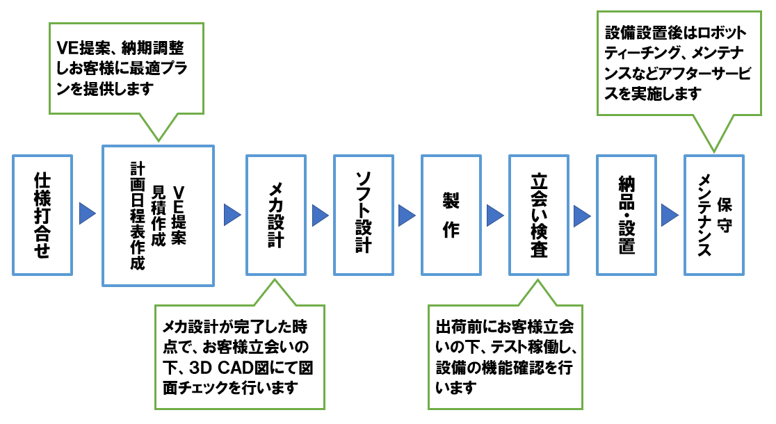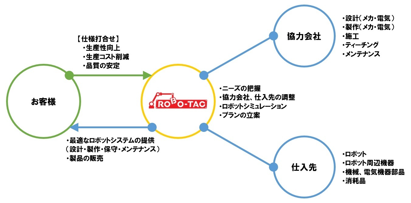 弊社は、日々多様化するロボットニーズに対し、⻑年培った経験とノウハウにより、ロボット販売のみならず、システムの初期検討から製作設置・アフターサービスまでオールインワンでサービスを提供します。