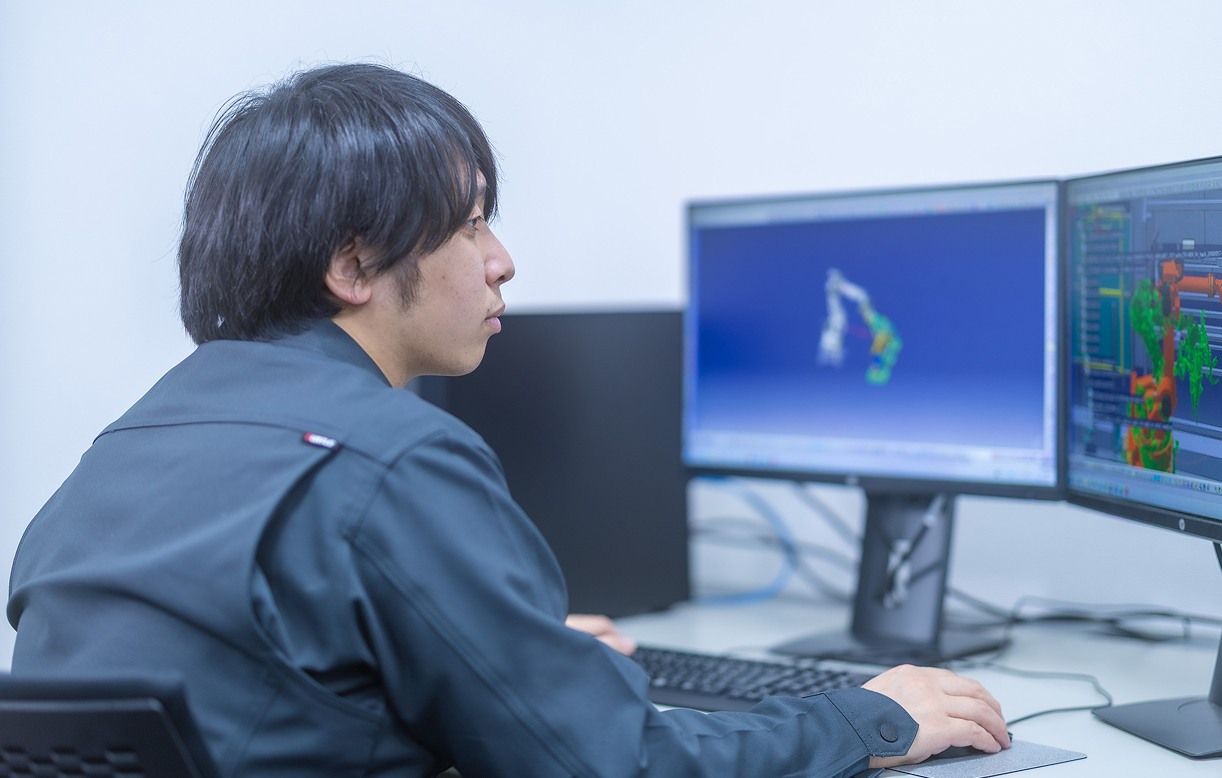 ロボットを実際に工場に入れる前にパソコン内のソフト(3DCAD)を使って、設置位置に問題はないか、 どこかぶつかるところはないかを確認する業務(検討業務)などを行っています。 主に車関係の製造ロボットを検討していますが、別の業種のロボットを検討したりもしています