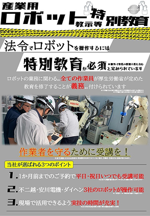 ロボット操作(教示等)や検査・修理・調整・結果の確認(検査等)、更にはそれらの操作に携わるすべての従業員の方は厚生労働省が定めた教育を修了し必要な知識・技術を習得することが法令によって定められてます。